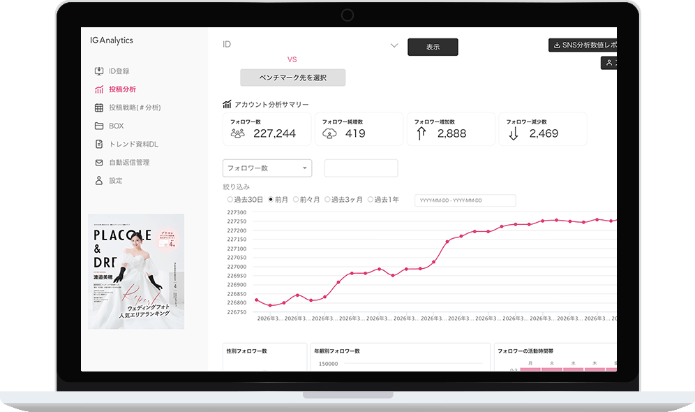 フォロワー属性の可視化、競合ベンチマーク比較。